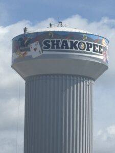 Water tower #3 on Co Rd 83/Canterbury Rd is located in the heart of our entertainment district, located near Valleyfair, Canterbury Park and the new Mystic Lake Amphitheater. Thousands of visitors travel to Shakopee each year and this tower provides the perfect opportunity to promote our community branding. The white and gray color scheme, with the custom graphic that depicts community features and activities available in Shakopee, is a fresh change. This graphic replaces the standard SPU logo and “Shakopee” artwork. Seen from miles, this tower will be the iconic water tower for Shakopee, much like the “golf ball and tee” tower on 10th Avenue was in the seventies.