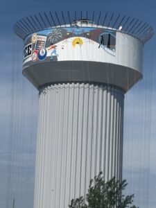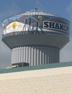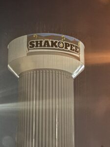 Water tower #3 on Co Rd 83/Canterbury Rd is located in the heart of our entertainment district, located near Valleyfair, Canterbury Park and the new Mystic Lake Amphitheater. Thousands of visitors travel to Shakopee each year and this tower provides the perfect opportunity to promote our community branding. The white and gray color scheme, with the custom graphic that depicts community features and activities available in Shakopee, is a fresh change. This graphic replaces the standard SPU logo and “Shakopee” artwork. Seen from miles, this tower will be the iconic water tower for Shakopee, much like the “golf ball and tee” tower on 10th Avenue was in the seventies.